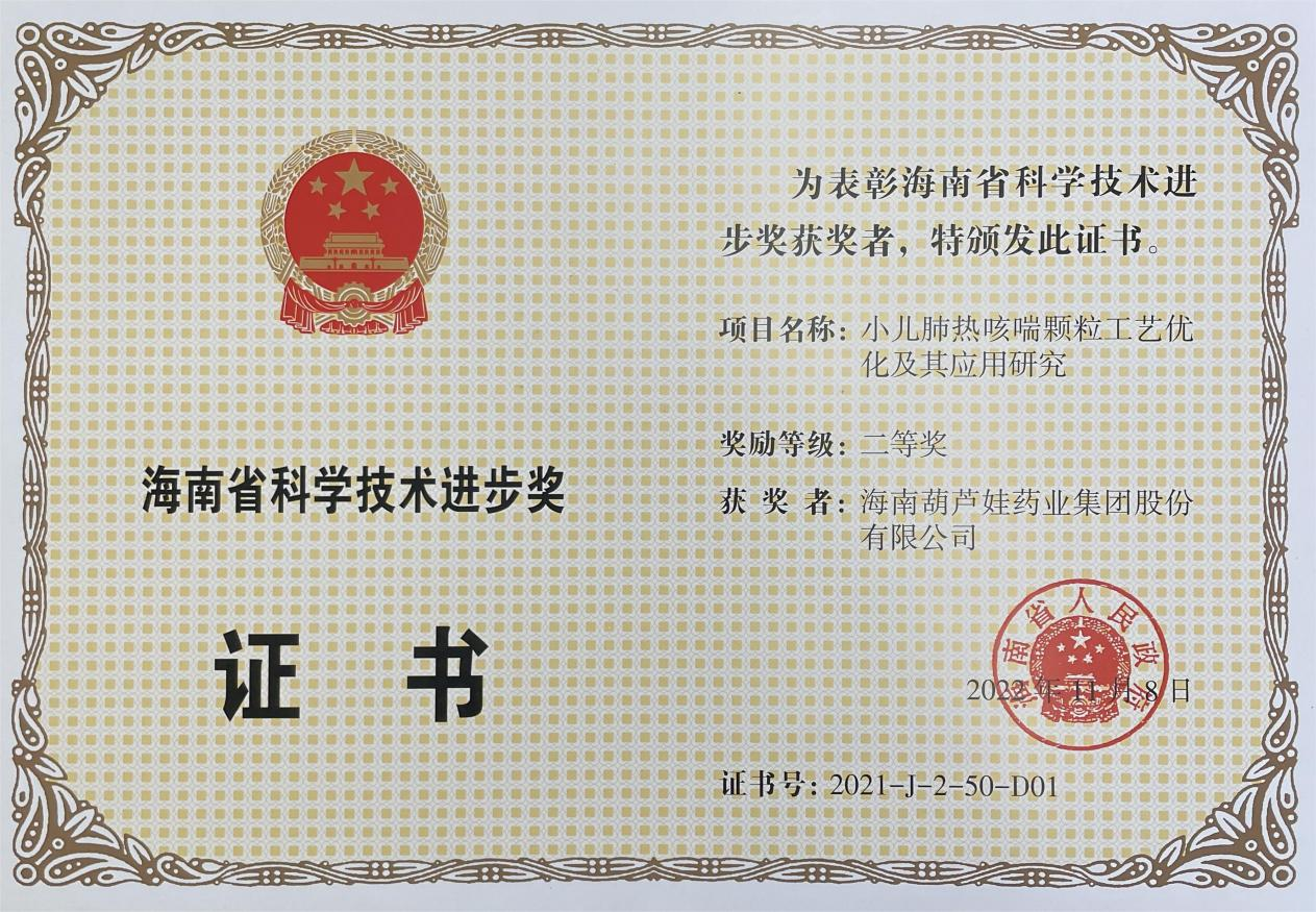 为此,小儿肺热咳喘颗粒的制备方法获得了第二十一届中国专利优秀奖(2019年),专利申请号:ZL201010134951,此次作为专利技术的应用,获得了2021年度海南省科学技术进步奖二等奖。在此之前,3522vip浦京集团牌小儿肺热咳喘颗粒还多次被授予“临床价值中成药品牌”、“中国连锁药店最具合作价值单品”,荣登“中国医药品牌榜”。